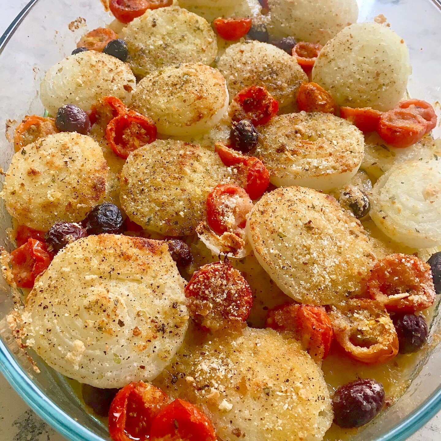 Ingredienti per 4 persone: 8 cipolle novelle (bianche) 10 pomodorini ciliegina Olive pugliesi in salamoia 4 cucchiai di olio extravergine d’oliva 4 cucchiai di pane grattugiato 4 cucchiai di formaggio pecorino grattugiato Timo limone e origano Sale e pepe Q.B.