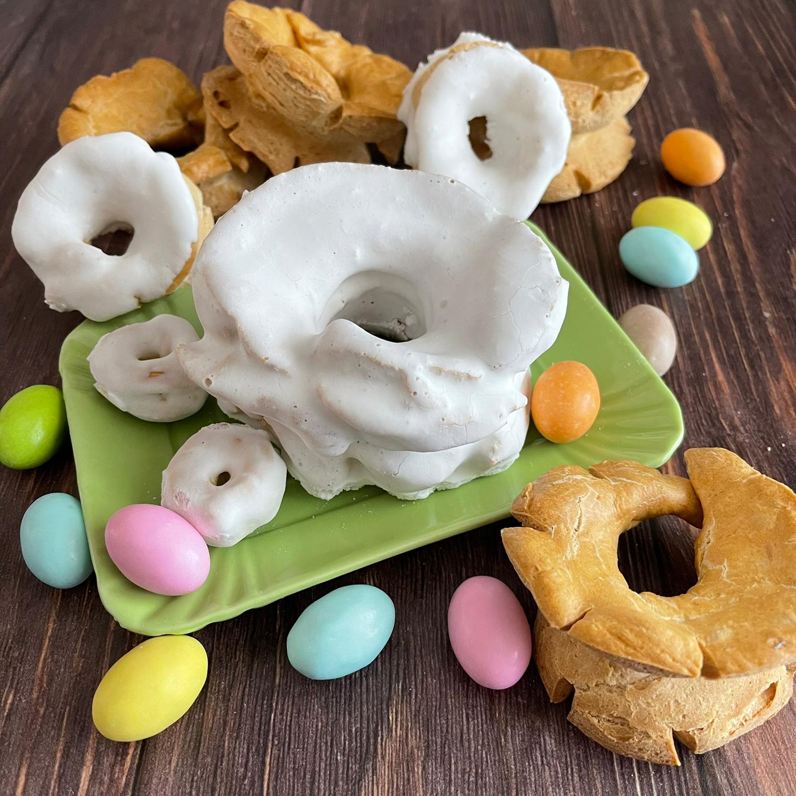 Preparare questi taralli richiede una certa esperienza e pazienza nella lavorazione della massa, una estrema cura nella scelta degli ingredienti e un requisito fondamentale che non nessuno rivela: l'utilizzo di un forno professionale per poterli cuocere. Io che per professione ho la possibilità di averne uno, li ho realizzati facilmente ma non vi nego che, preparandoli a casa con la stessa ricetta e con lo stesso metodo di impasto, al momento della cottura non si sono gonfiati come avrebbero dovuto. A chi mi chiede: "le nostre nonne allora come facevano?" ricordo che, le nostre antenate cuocevano le preparazioni dolciarie nei forni di paese, forni comunitari dove, dietro piccolo compenso potevi cuocere di tutto previa prenotazione. Da noi, qui in Puglia, abbiamo ancora la possibilità di farlo, rivolgendoci a qualsiasi panetteria del nostro paese. Ingredienti per circa 10 taralli: -300 gr di farina 00 -3 uova intere -40 gr di olioextravergine d'oliva -1,5 gr di bicarbonato d'ammonio (ammoniaca per dolci) -2 gr di sale fino -1 cucchiaio di acquavite (grappa/whisky/brandy/ecc...) Procedimento: Con l'ausilio di una impastatrice planetaria, ho montato le uova insieme al sale, l'ammoniaca e l'acquavite. Dopo aver ben montato le uova vi ho addizionato tre parti di olio, versandolo a filo e tenendone da parte la restante che mi è servita per chiudere l'impasto sulla spianatoia. Subito dopo, ho versato la farina, un cucchiaio per volta, fino al suo completo assorbimento.Dopo aver incorporato tutta la farina ho sostituito la frusta con il gancio a uncino e ho lasciato impastare a velocità media per circa dieci minuti.Ho versato l'impasto su di una spianatoia unta con la dose dell'olio tenuto da parte e ho chiuso l'impasto facendo qualche piega per compattarlo. Ho tirato dei serpentelli dello spessore di un cm e mezzo e della lunghezza di circa 12 cm e ho formato dei taralli. Dopo averli completati li ho sbollentati in acqua a 90°C, pochi per volta e per 2/3 minuti circa (un minuto per lato). Dopo aver completato l'operazione li ho lasciati asciugare, coperti con un canovaccio per circa un'ora. Trascorso il tempo ho preriscaldato il mio forno professionale a 180°C, ho dato il taglio tipico che li contraddistingue, in orizzontale e ho infornato per 35 minuti. Ho conservato i miei taralli in una scatola ermetica e li glasserò per Pasqua. La ricetta della glassa nella prossima scheda.