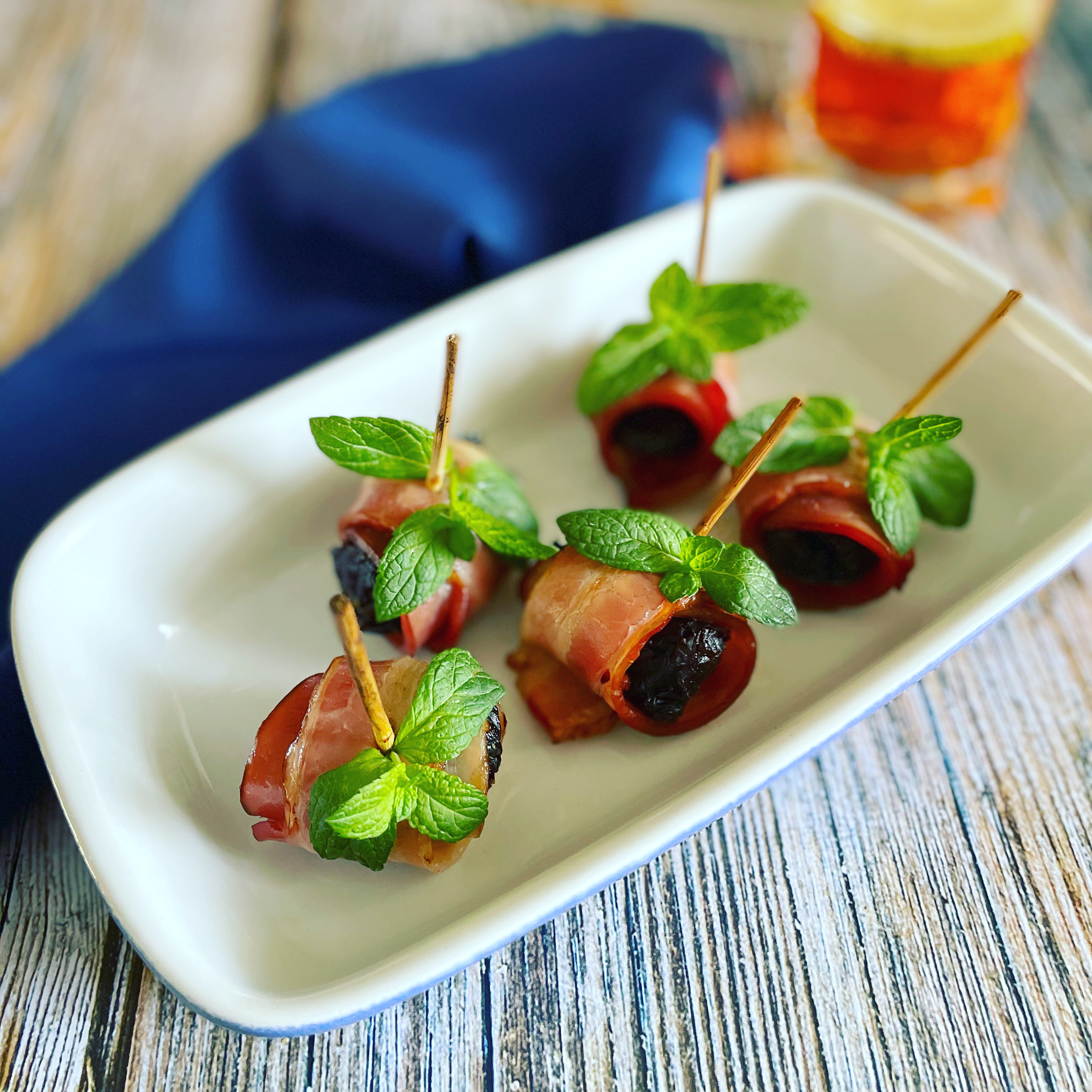 Ho avvolto ogni prugna nelle fette di bacon e fermato con uno stecchino.