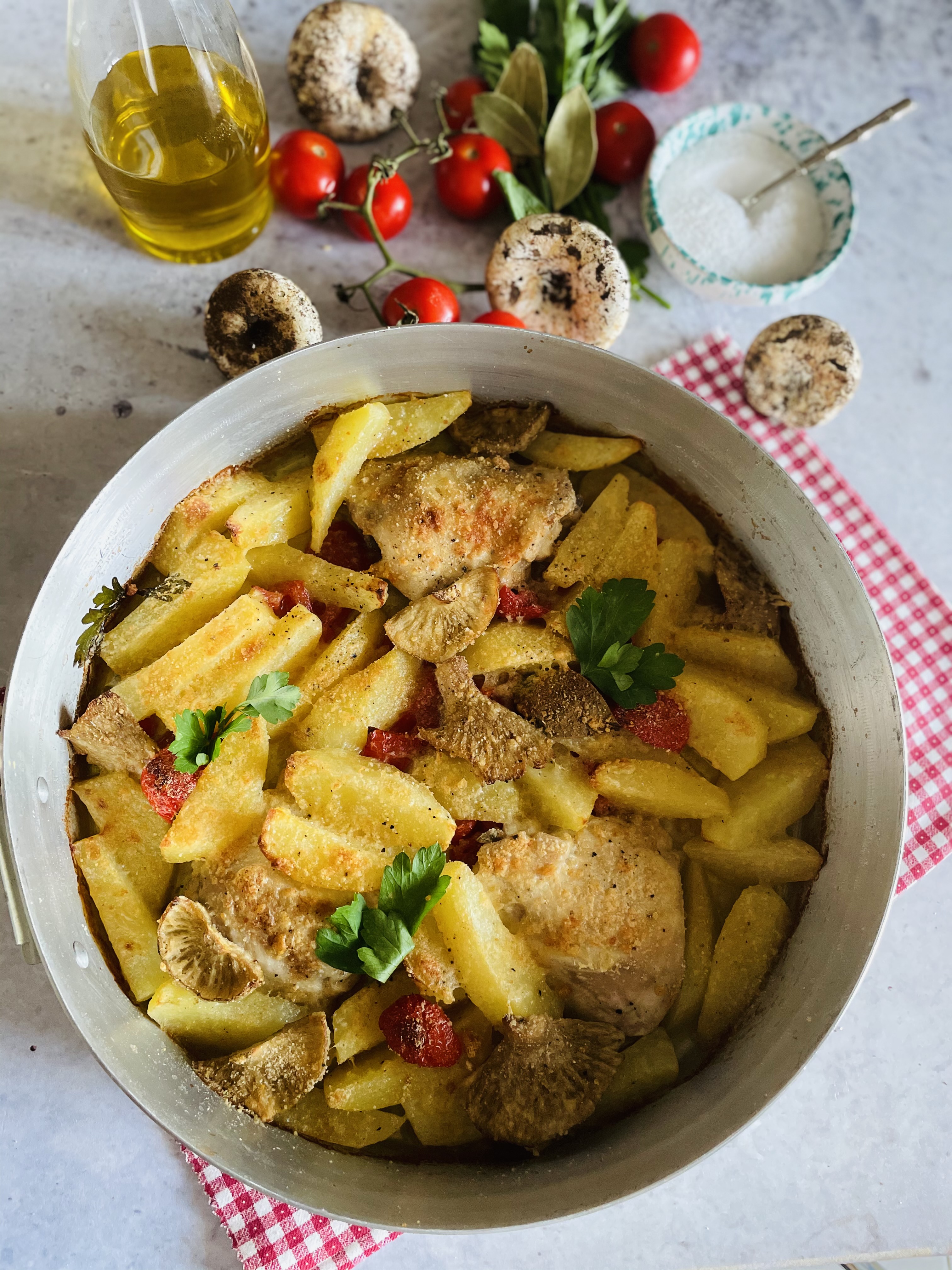 Ho sistemato i pezzi di pollo sul fondo di verdure della tiella, li ho salati leggermente, ho irrorato con il vino e vi aggiunto le patate e i funghi conditi precedentemente.