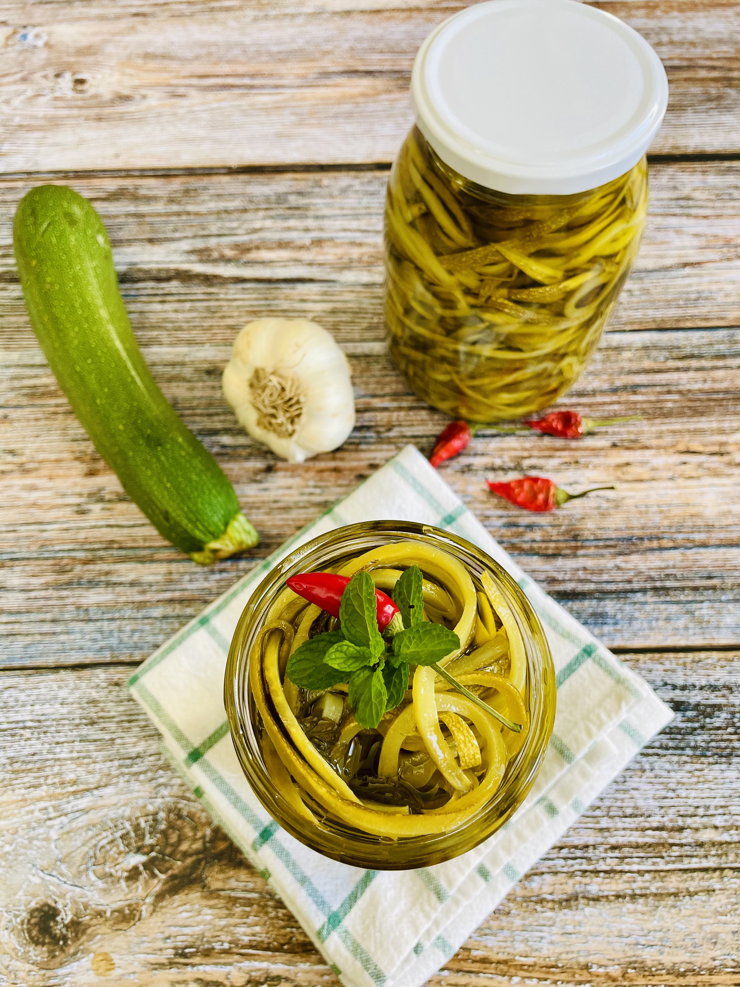 Ho invasato creando degli strati omogenei e alternati. Ho incominciato, versando prima l’olio, poi le zucchine, gli aromi sgocciolati dall’aceto e tamponati con la carta assorbente e poi con altro olio fino ad arrivare un po’ più sotto al collo del vaso, per lasciare all’olio il compito di preservare gli ortaggi dalla formazione della muffa.