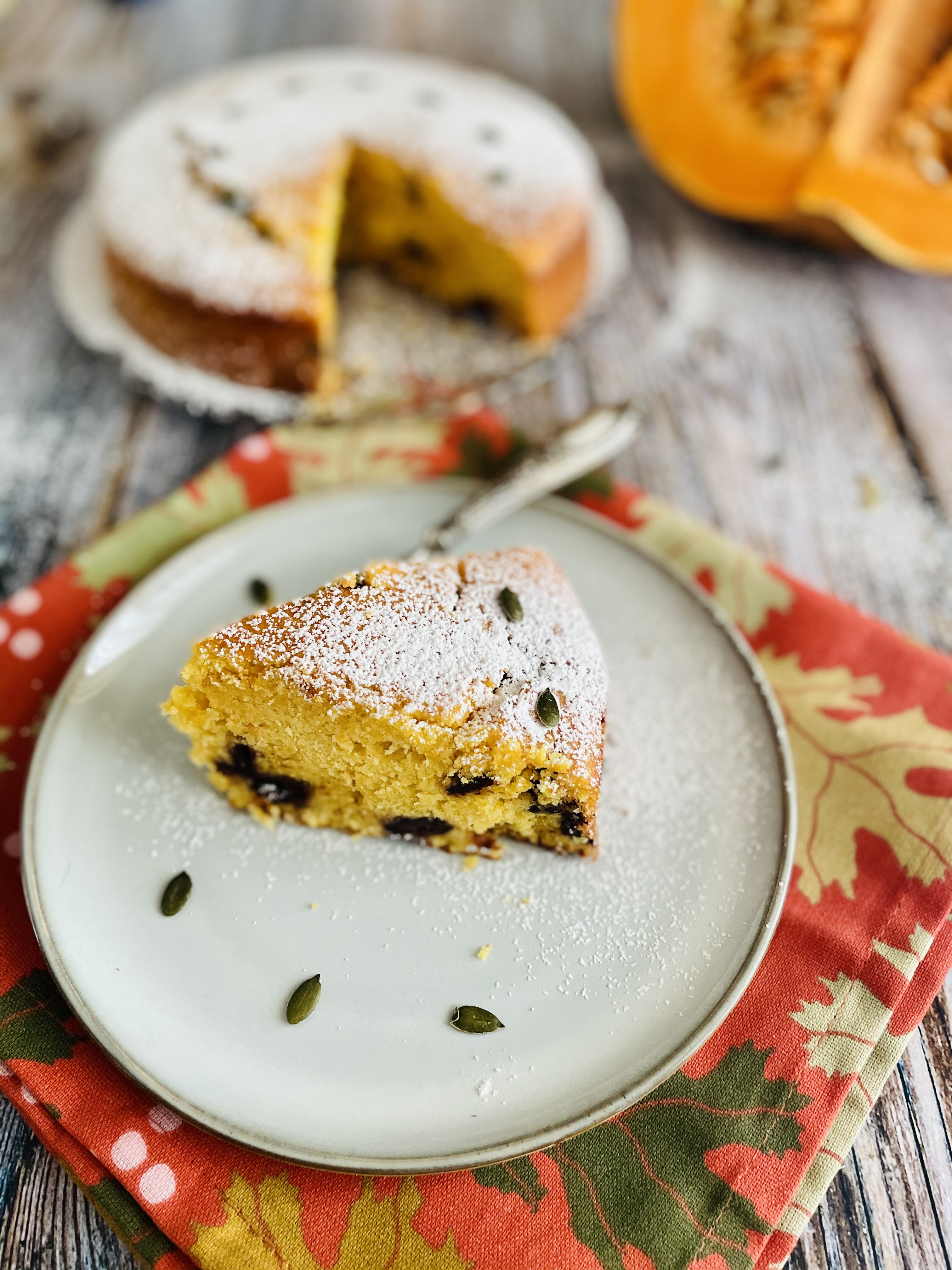 Dopo aver sformato la torta e fatta raffreddare, l'ho spolverata con zucchero a velo e decorato con semi di zucca.